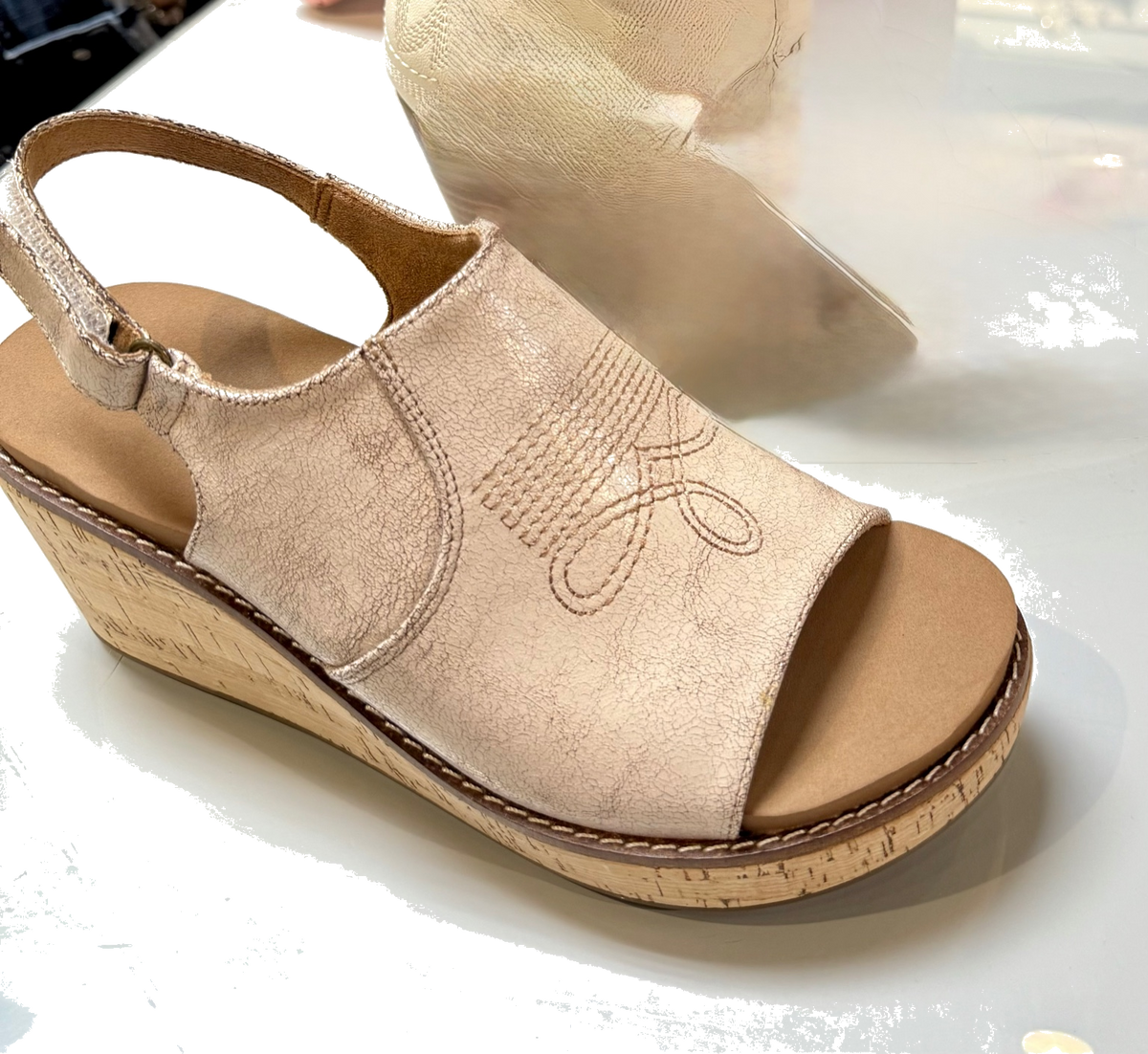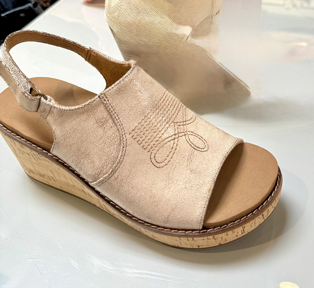 - Lightweight cork wedge for all-day wear