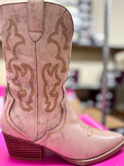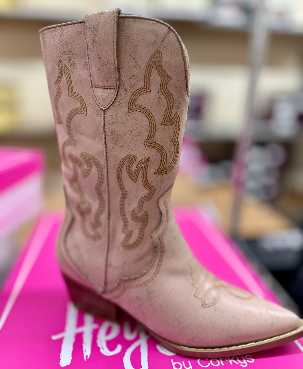Step into western charm with a feminine twist in these Hey Girl by Corkys boots. Designed in a soft blush-pink tone with classic western stitching, these boots bring just the right mix of rugged and pretty. The gently distressed finish adds character, while the comfortable stacked heel makes them perfect for all day wear.